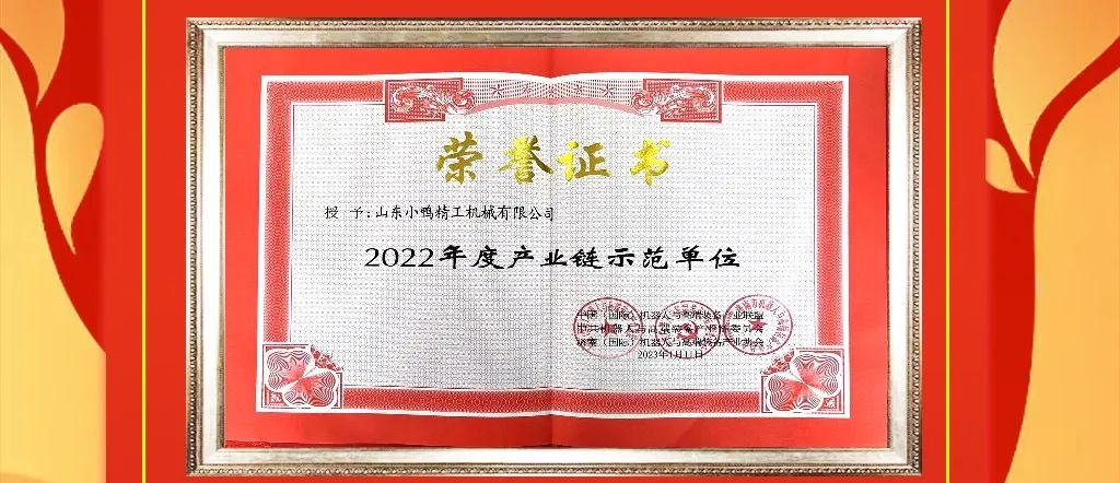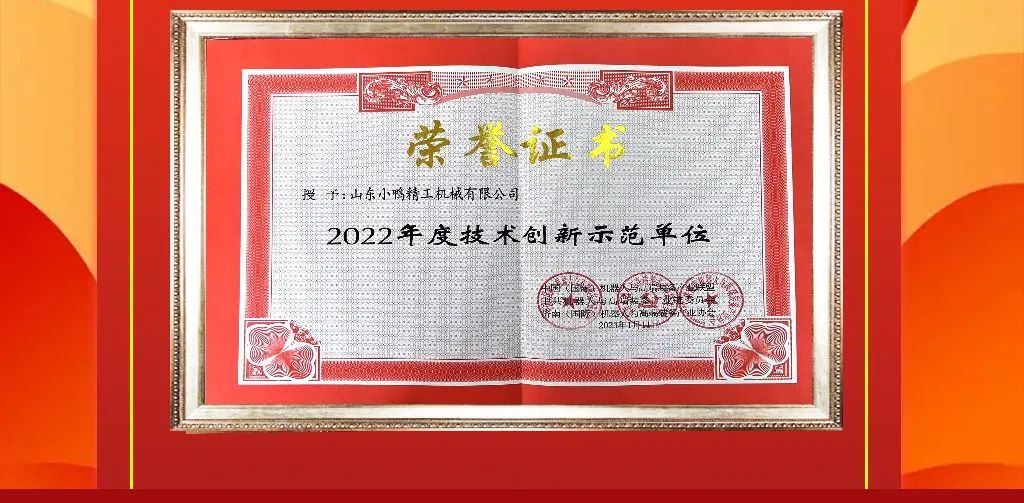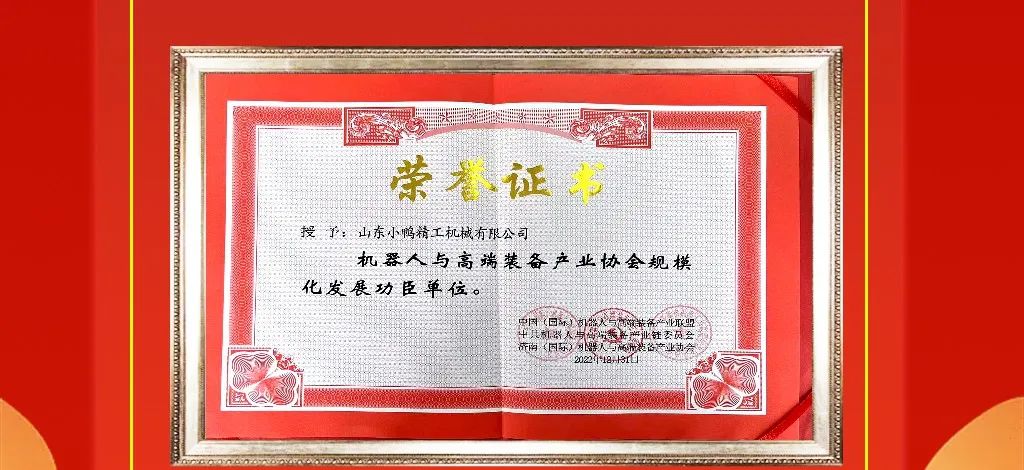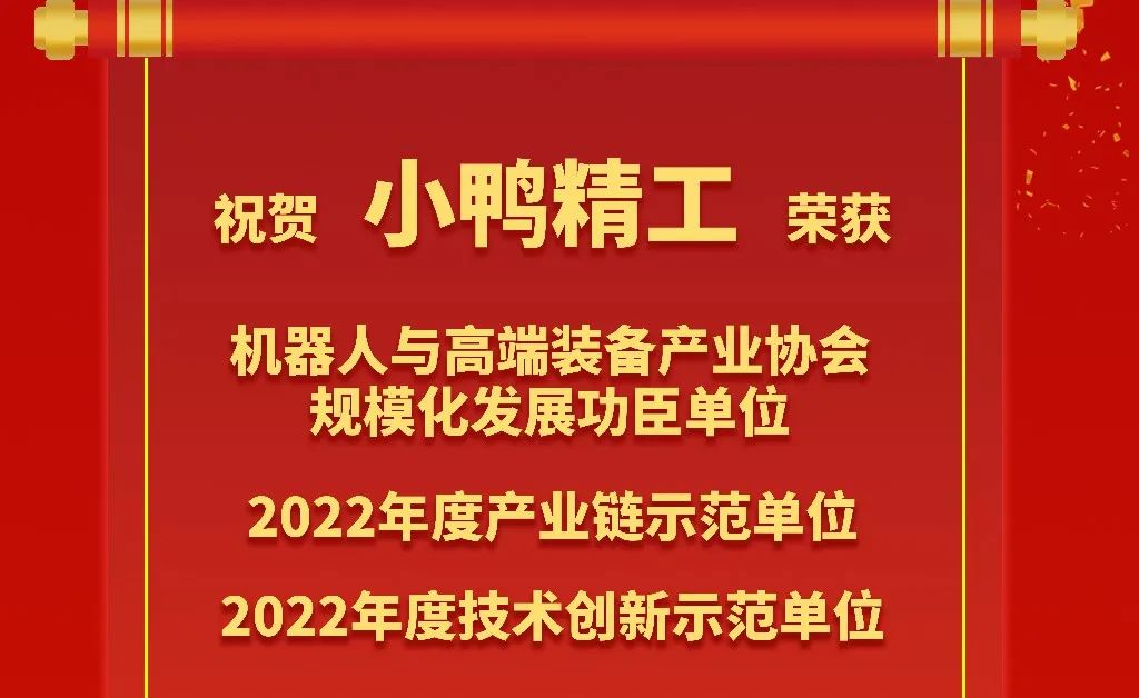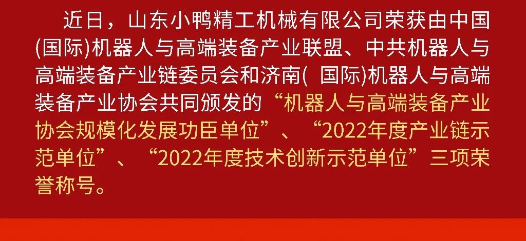 近日,山東小鴨精工機(jī)械有限公司榮獲由中國(國際)機(jī)器人與高端裝備產(chǎn)業(yè)聯(lián)盟、中共機(jī)器人與高端裝備產(chǎn)業(yè)鏈委員會(huì)和濟(jì)南( 國際)機(jī)器人與高端裝備產(chǎn)業(yè)協(xié)會(huì)共同頒發(fā)的“機(jī)器人與高端裝備產(chǎn)業(yè)協(xié)會(huì)規(guī)?;l(fā)展功臣位”“2022年度產(chǎn)業(yè)鏈?zhǔn)痉秵挝弧薄?022年度技術(shù)創(chuàng)新示范單位”三項(xiàng)榮譽(yù)稱號。