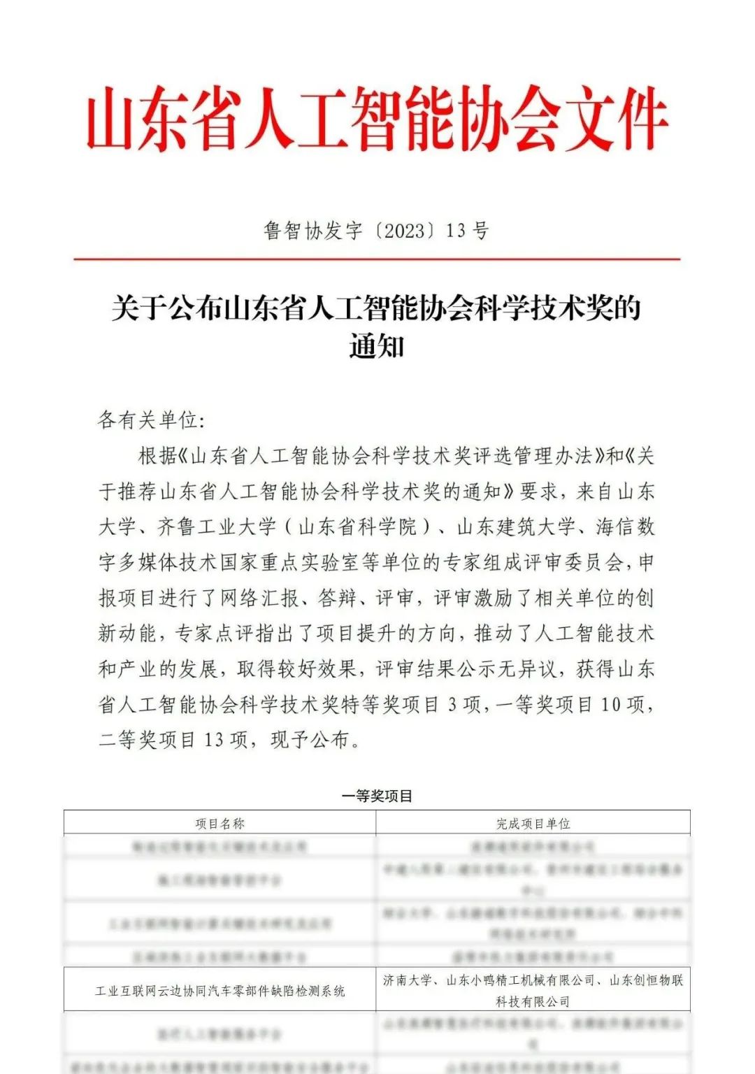 小鴨精工榮獲山東省人工智能科學(xué)技術(shù)一等獎(jiǎng)
